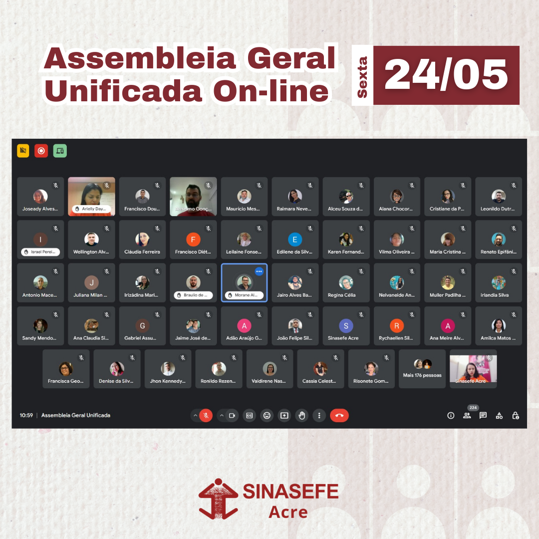 A Diretoria Executiva do Sinasefe Acre convoca a todas(os) servidoras(es) do Instituto Federal do Acre (Ifac) para a Assembleia Geral Unificada On-line que ocorrerá na sexta-feira, 24 de maio, às 9h. O link de participação foi enviado por e-mail às(aos)