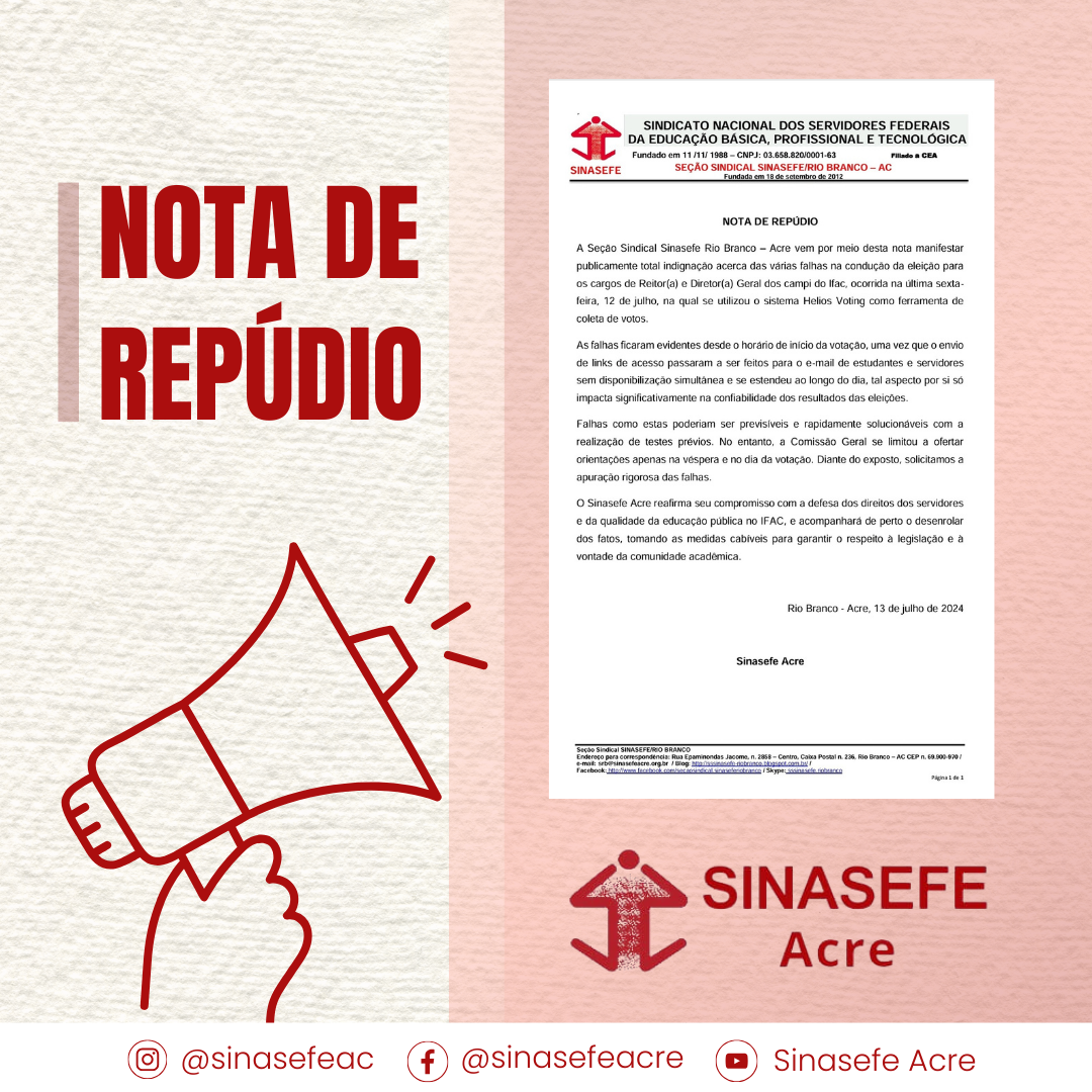 A Seção Sinasefe Rio Branco – Acre vem por meio desta nota manifestar publicamente total indignação acerca das várias falhas na condução da eleição para os cargos de Reitor(a) e Diretor(a) Geral dos campi do Ifac, ocorrida na última sexta-feira, 12 de julho, na qual se utilizou o sistema Helios Voting como ferramenta de coleta de votos.