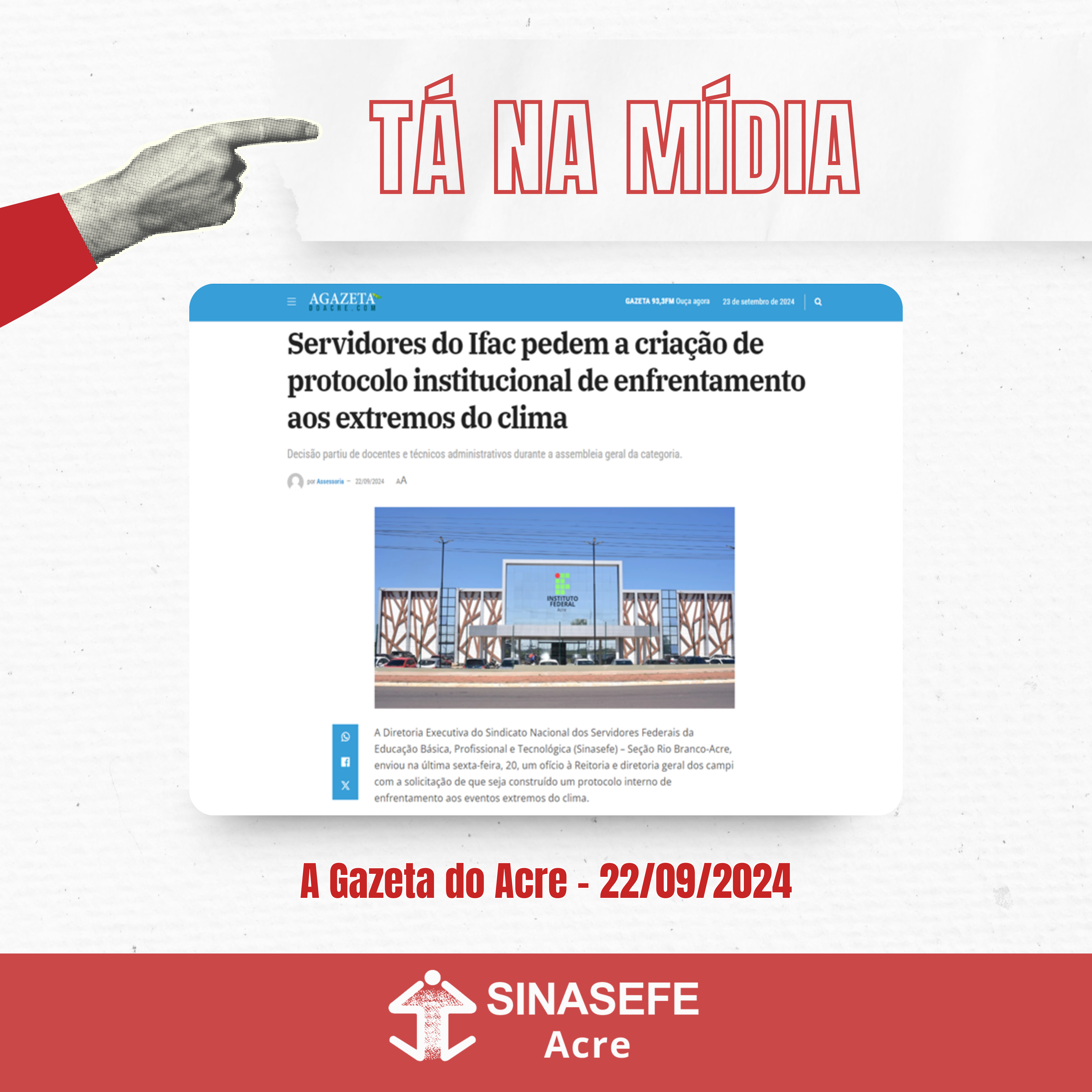 O pedido de construção de um protocolo institucional para enfrentamento da crise climática nos campi do Ifac foi pauta de matéria publicada no site de notícias A Gazeta do Acre no domingo, 22 de setembro. Agradecemos ao site por nos