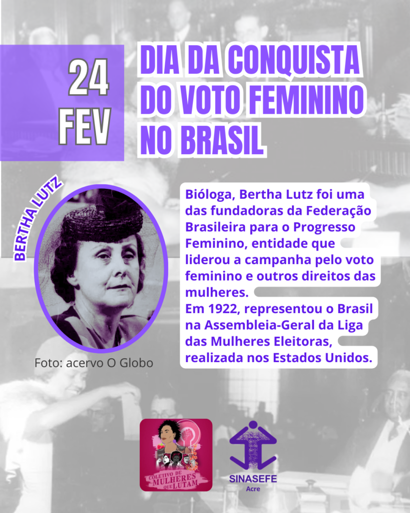 1- Bertha Lutz: Bióloga, Bertha Lutz foi uma das fundadoras da Federação Brasileira para o Progresso Feminino, entidade que liderou a campanha pelo voto feminino e outros direitos das mulheres. Em 1922, representou o Brasil na Assembleia-Geral da Liga das Mulheres Eleitoras, realizada nos Estados Unidos.