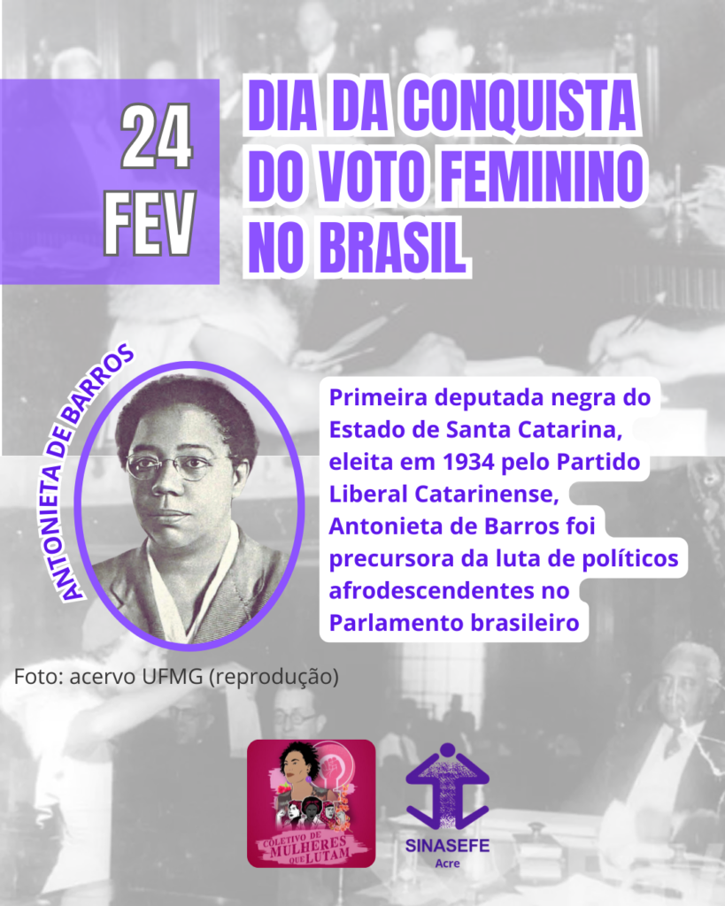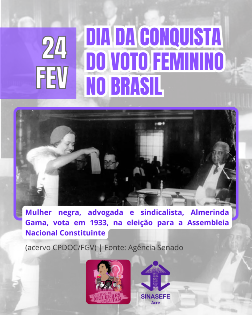 4- A imagem de fundo mostra Almerinda Gama, mulher negra, advogada e sindicalista, enquanto deposita seu voto na urna, em 1933, durante a eleição para a Assembleia Nacional Constituinte.