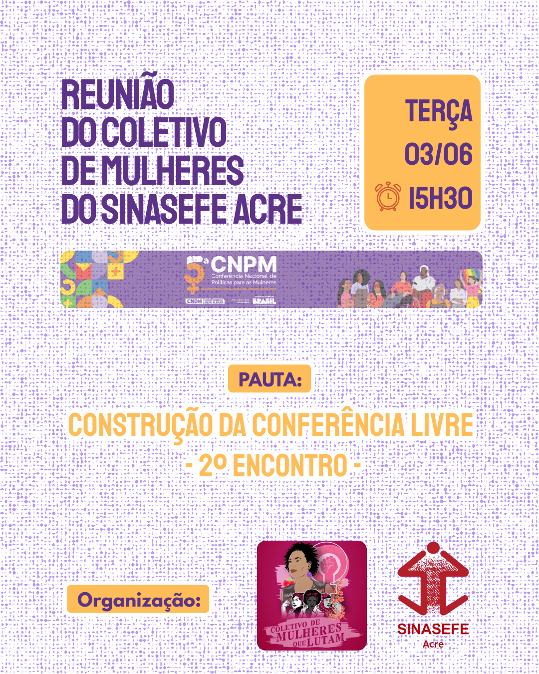 O Coletivo de Mulheres de nossa seção sindical terá nesta terça-feira, 03/06, às 15h, a segunda reunião de organização da Conferência Livre que contribuirá com a 5ª Conferência Nacional de Políticas para as Mulheres (5ª CNMA).Entre os pontos a serem