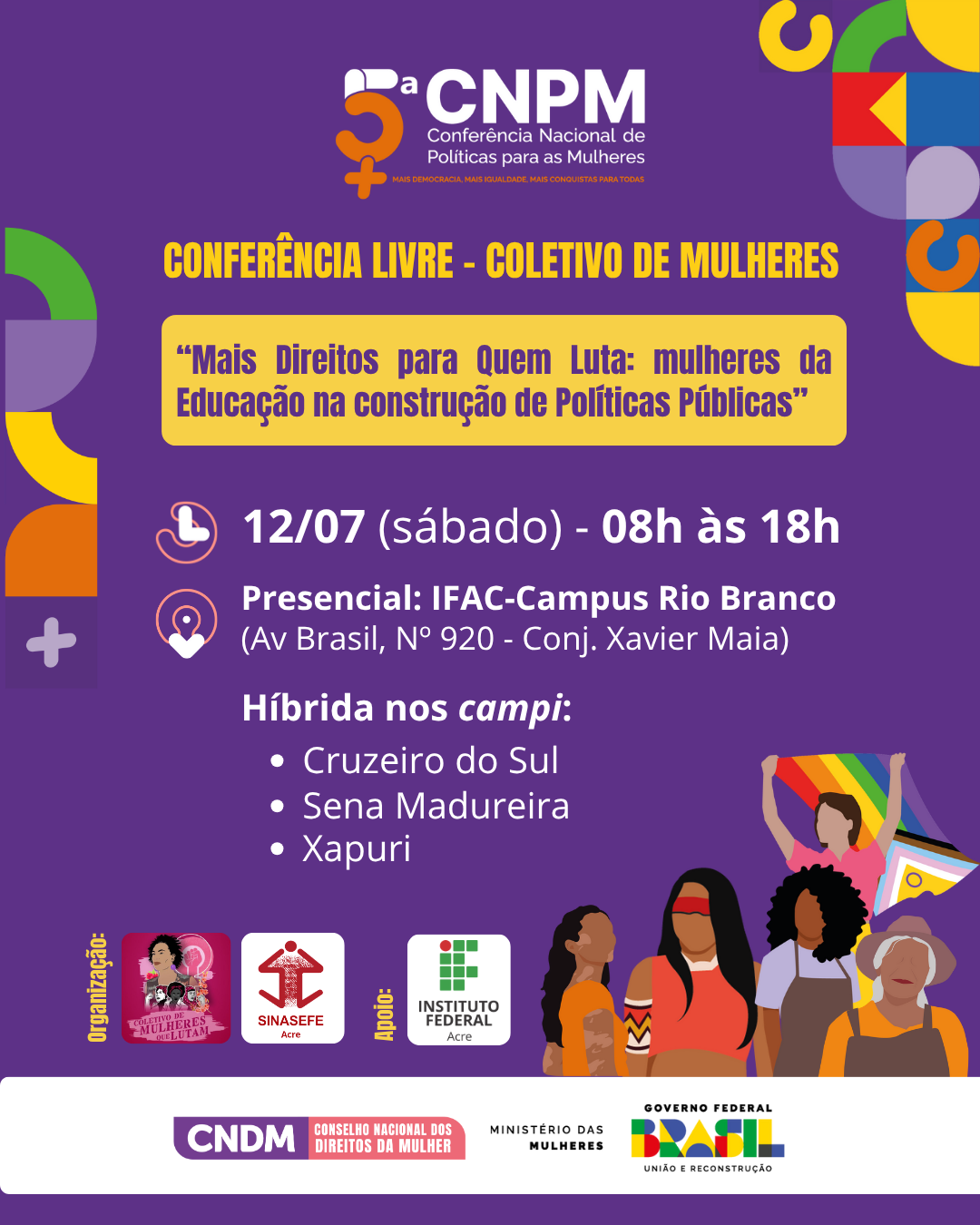 O Coletivo de Mulheres que Lutam da seção Sinasefe Rio Branco-Acre organiza para o dia 12 de julho, sábado, sua primeira Conferência Livre. Ali, serão elaboradas propostas de políticas públicas e eleitas delegadas para a 5ª Conferência Nacional de Política para Mulheres (5ª CNPM).