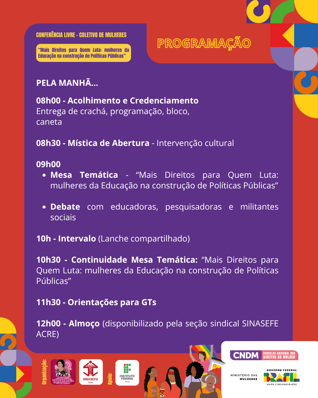 5ª CNPM: Conheça a programação da CL do Coletivo de Mulheres do Sinasefe Acre!5ª CNPM: Conheça a programação da CL do Coletivo de Mulheres do Sinasefe Acre!