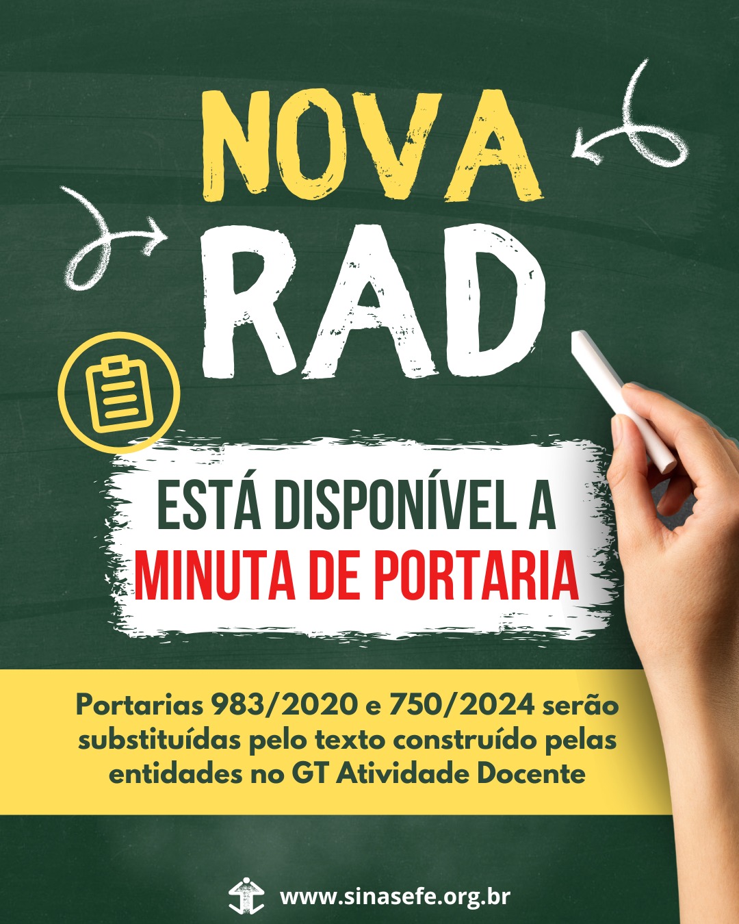 Texto: Mário Júnior (Ascom SINASEFE) Atenção docentes da base do SINASEFE: após longo debate com o Ministério da Educação (MEC), está finalizada a Minuta de Portaria da nova Regulamentação da Atividade Docente (RAD). O documento foi produzido a várias mãos, em um Grupo