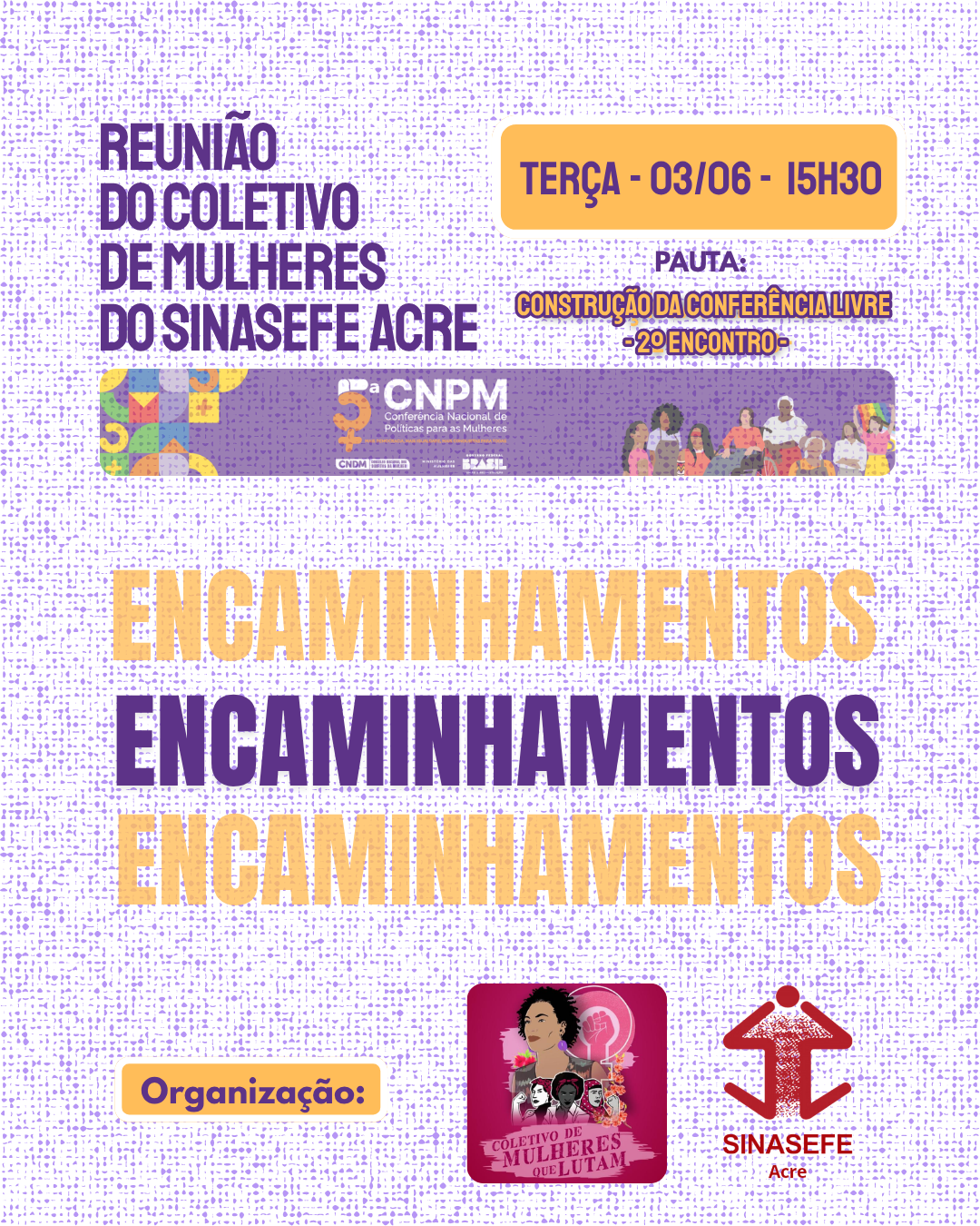 A segunda reunião de construção da Conferência Livre/5ª CNPM convocada pelo Coletivo de Mulheres ocorreu de forma virtual, no dia 03 de junho de 2025. Entre as deliberações estabeleceu-se que a CL do Coletivo será promovida no dia 12 de