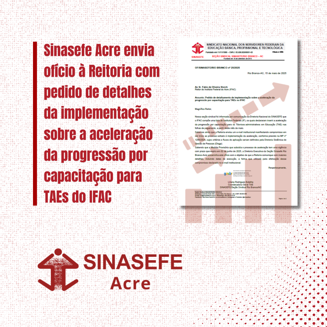Sinasefe Acre envia ofício com pedido de detalhamento sobre a implementação de aceleração da progressão por capacitação para TAEs do IfacSinasefe Acre envia ofício com pedido de detalhamento sobre a implementação de aceleração da progressão por capacitação para TAEs do Ifac