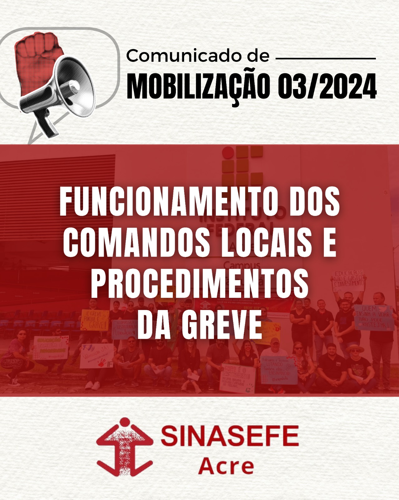 A Coordenação de Política e Formação Sindical do Sinasefe Acre disponibiliza o Comunicado de Mobilização 03/2024, sobre o Funcionamento dos Comandos Locais (CL) e Procedimentos da Greve, para que sigam se apropriando da organização do movimento junto à base. Os