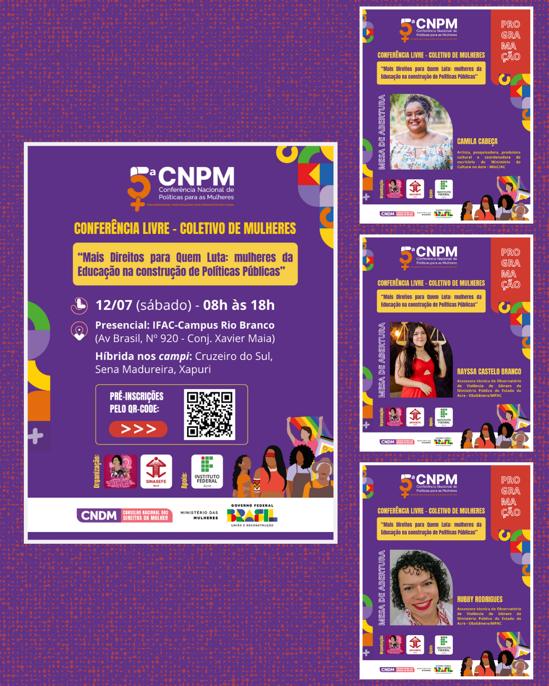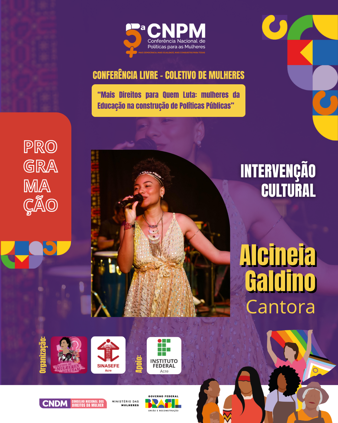 A Conferência Livre (CL) “Mais Direitos para Quem Luta: mulheres da Educação na construção de Políticas Públicas” ocorrerá neste sábado, dia 12 de julho. A abertura das discussões será com a mesa presencial no IFAC-Campus Rio Branco que recebe o