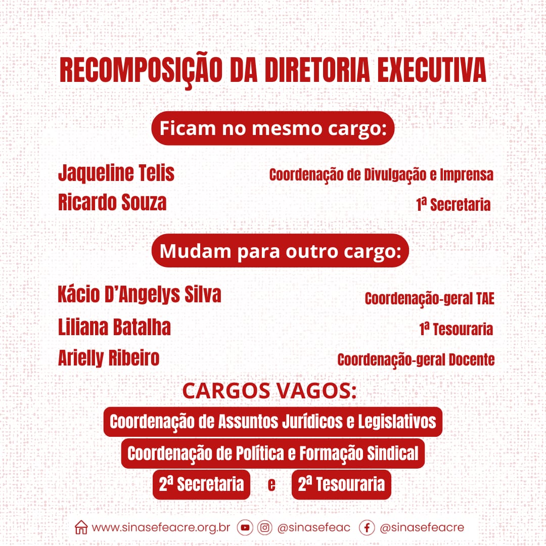 Entre os encaminhamentos da Assembleia Geral Unificada Online ocorrida na segunda-feira, 02/06, está a recomposição da Diretoria Executiva. Por maioria de votos, as(os) filiadas(os) aprovaram as mudanças:– Kácio D’Angelys Silva ocupará a função de Coordenação-geral TAE;– Liliana Batalha ocupará a